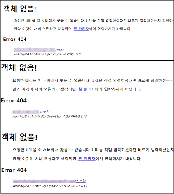 웹 서버 스택 정보가 모두 Apache/2.4.17 (Win32) OpenSSL/1.0.2d PHP/5.6.15로 동일합니다.