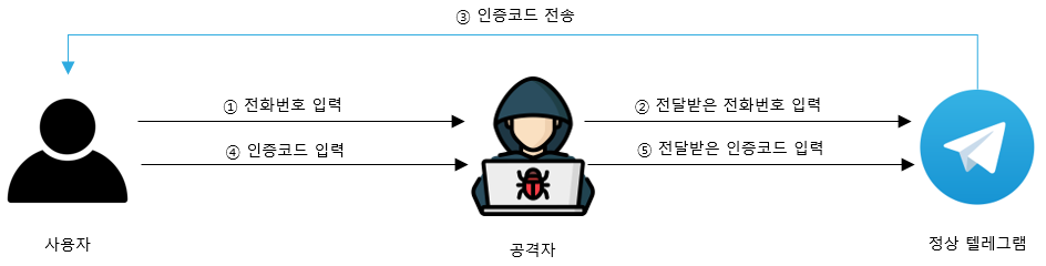 해당 공격에서 공격자는 사용자와 정상 텔레그램 사이에서 데이터를 전달해 주는 전달자 역할이며, 공격자가 사용자로부터 전달받은 입력값으로 사용자 계정에 접근이 가능하게 됩니다.