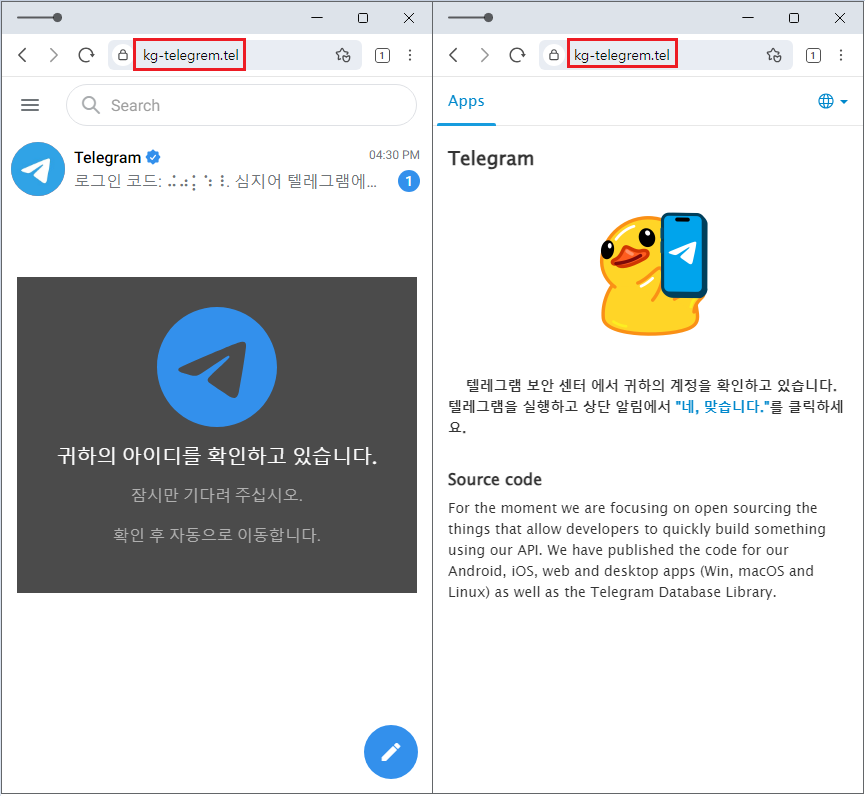 [국외발신]telegram계정보안활동이발견됩니다. 계정보완을위해, 다시로그인하세요 피싱링크
