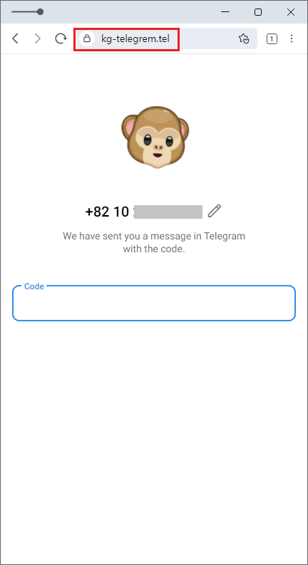 사용자가 스미싱 문자 내에 포함된 피싱 링크를 클릭하면 텔레그램 로그인 페이지와 유사하게 제작된 피싱 페이지로 접속됩니다.
