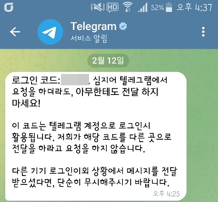 [국외발신] Telegram정책상 탈퇴예정이니 6시간내 인증바랍니다. 피싱링크