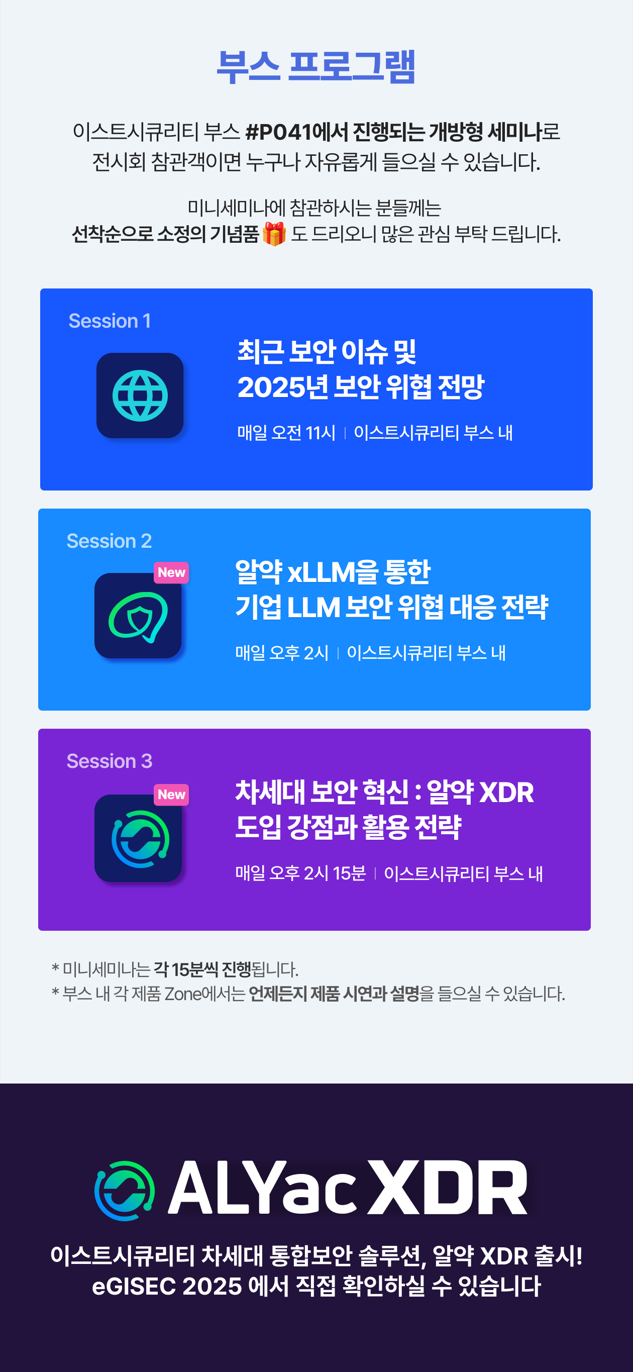 또한 부스에 방문해주시는 모든 고객 분들께서는 엔드포인트 보안 솔루션 (알약 및 알약 EDR 등)과 이메일 보안 솔루션, 문서중앙화 솔루션(시큐어디스크·인터넷디스크)과 기업 AI 보안 솔루션(알약 xLLM) 등 이스트시큐리티의 다양한 제품을 직접 확인하실 수 있습니다.