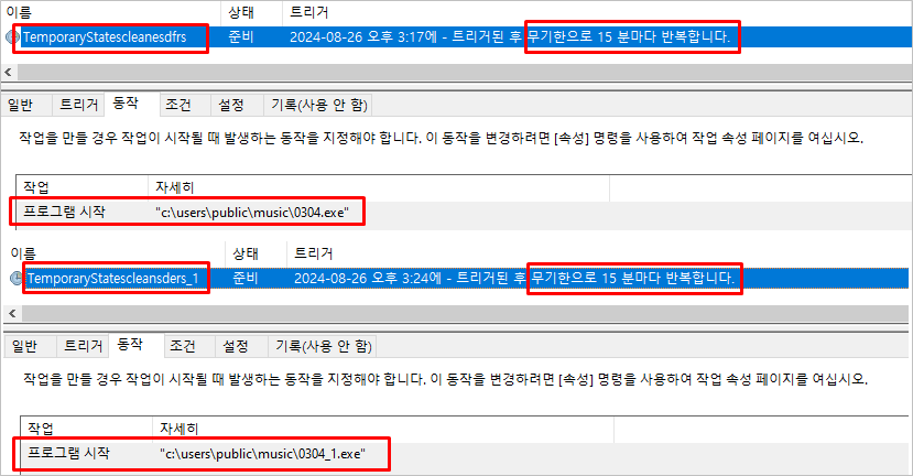 지속성 유지를 위해 2개의 작업 스케줄러를 등록하며 15분마다 반복적으로 동작을 수행합니다.