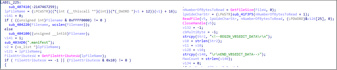Adersoft의 VbsEdit 런처 파일(9.2.13.9 버전)의 기능을 악용하였다. 이 런처 파일은 자신과 동일한 파일명에 .manifest 확장자를 가진 파일을 로드한 후, "<!--BEGIN_VBSEDIT_DATA" 부터 "END_VBSEDIT_DATA-->" 사이에 포함된 Base64로 인코딩된 Visual Basic Script를 디코딩하여 실행