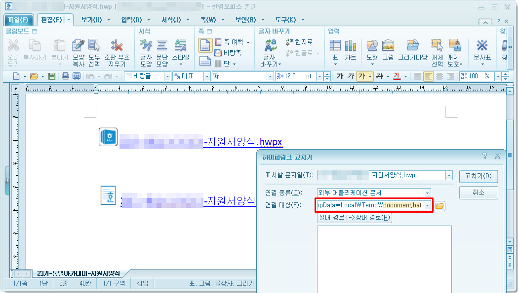 공격에 사용된 지원서 파일은 HWP 형식의 문서파일로, 본문 내용에 다운로드 링크로 보여지는 문구가 기재되어 있으며, 링크 클릭 시 외부 링크 주소가 아닌 HWP 파일 내 OLE 개체 형태로 추가된 document.bat 파일이 실행됩니다.