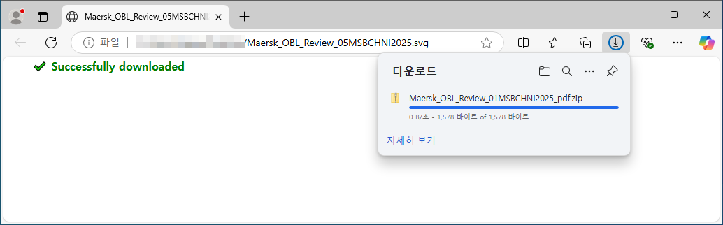 사용자가 선적물에 대한 내용을 확인하기 위해 첨부파일을 실행하면 웹 브라우저를 통해 SVG 파일이 실행되며, Maersk_OBL_Review_01MSBCHNI2025_pdf.zip 파일이 다운로드 되었다는 메시지가 나타납니다.