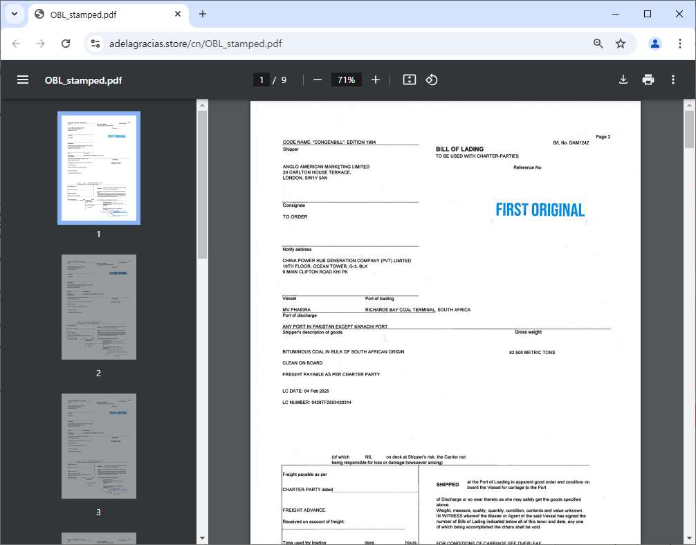 미끼 문서인 PDF 파일은 선적물과 관련된 문서로 작성되어 있습니다.