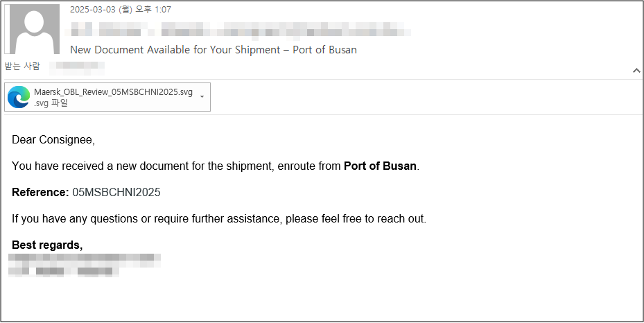 해당 공격은 글로벌 해운 업체의 선적물 안내 메일로 위장한 피싱 메일을 통해 유포되었으며, 메일 내 첨부파일 형태로 SVG 포맷의 악성코드가 존재합니다.