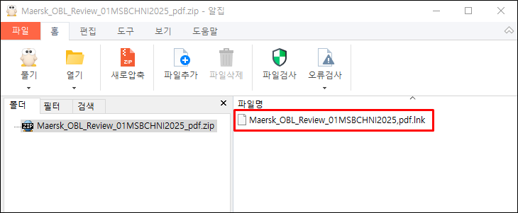 생성된 압축파일 내부에는 PDF 아이콘으로 위장한 바로 가기(LNK) 파일이 존재합니다.