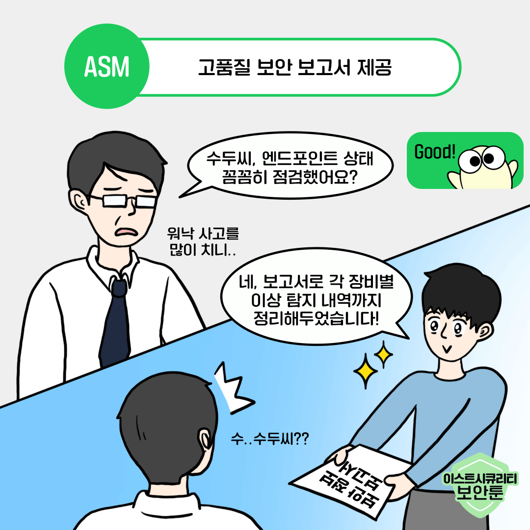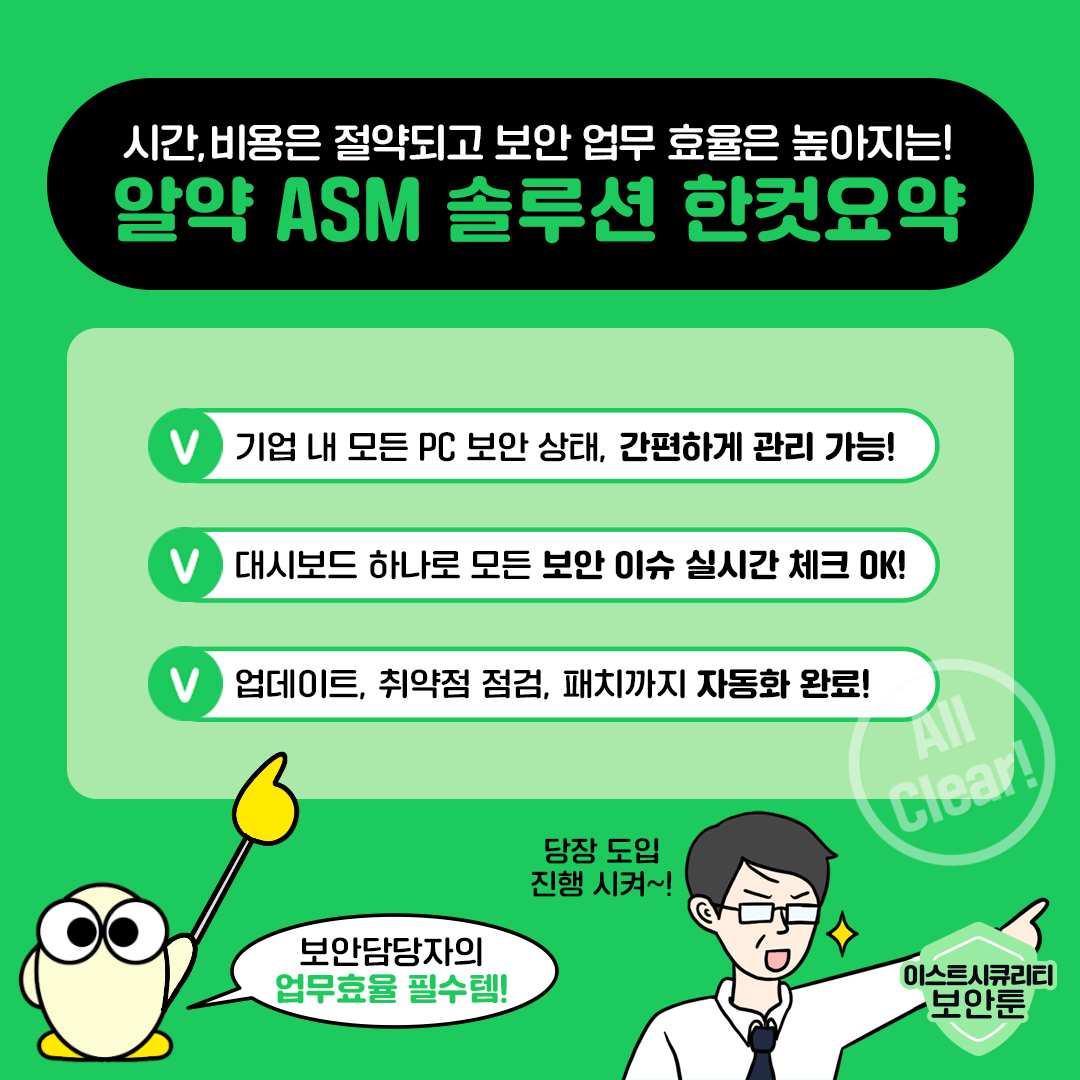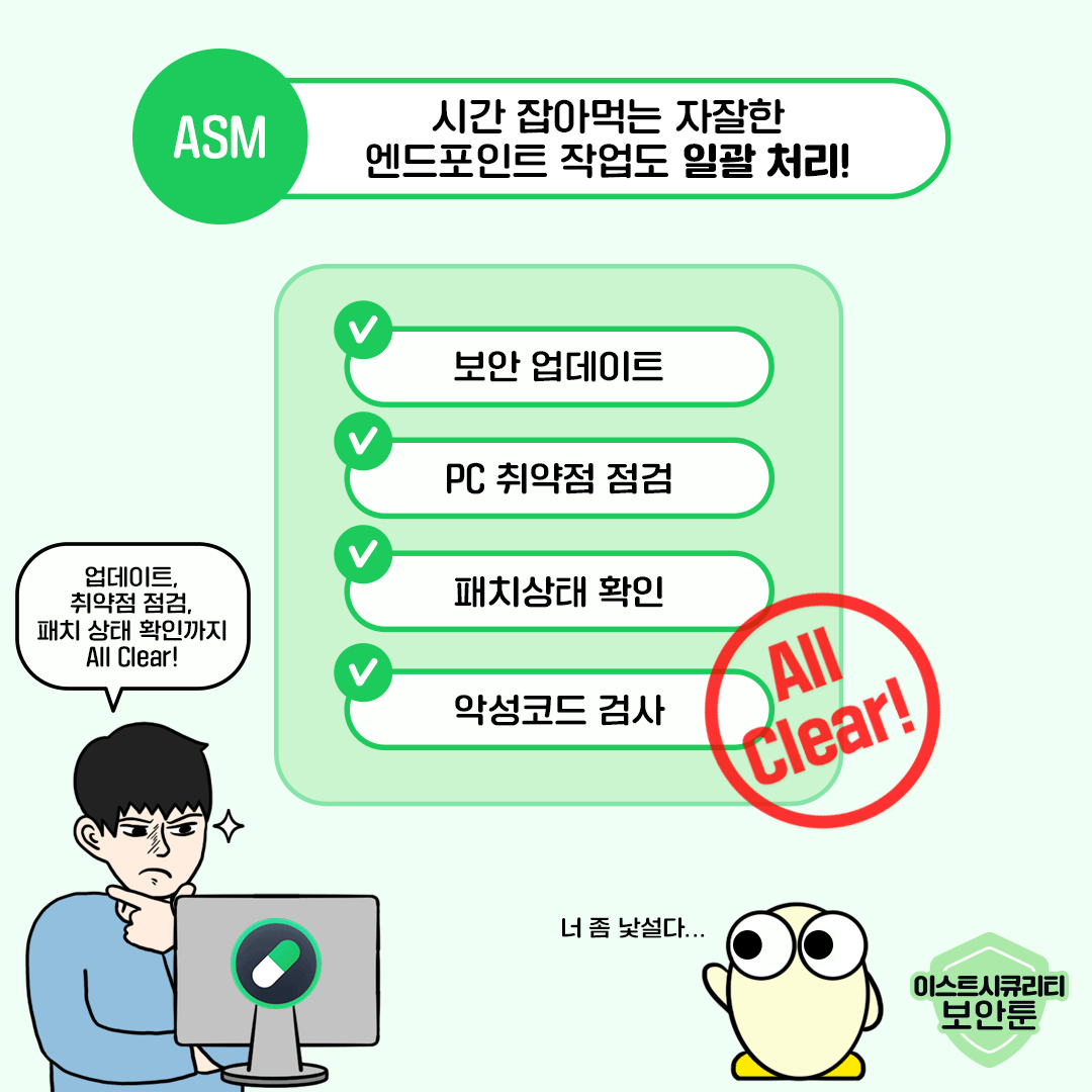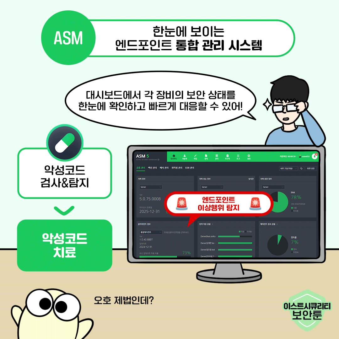 보안 관리부터 위협 탐지, 패치 업데이트, 자산 관리까지... 해야 할 일은 많은데, 인력과 시간이 부족해 어려움을 겪고 계시는 보안 담당자 분들이 많으실텐데요. 이번 보안툰에서는 ASM 5를 통해 체계적으로 엔드포인트 보안 관리가 가능한 이유를 알려드리겠습니다. 시간과 비용을 아끼면서 기업의 IT 자산은 완벽하게 지켜내는 스마트하고 효율적인 업무 환경을 만들고 싶다면? 지금 바로 확인해 보세요.