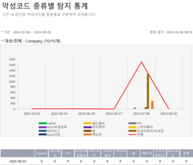백신 설치 현황, 악성코드 탐지 결과 및 탐지자 통계 등 백신관리에 대한 정보가 담긴 보고서를 제작할 수 있습니다.