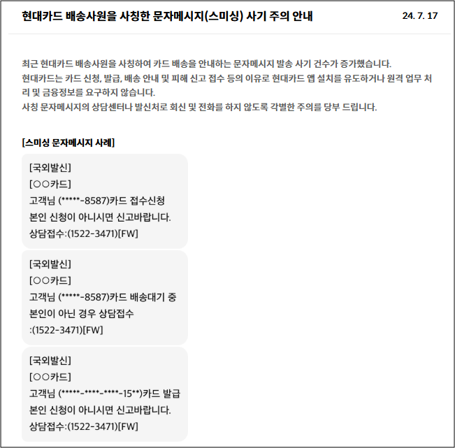 최근 휴대폰 문자 메시지에 카드 발급또는 결제 완료등의 사기성 메시지와 함께 전화번호만 기재하여 수신자의 전화를 유도하는 일명 콜백 스미싱이 증가하고 있어 사용자분들의 주의가 필요합니다.