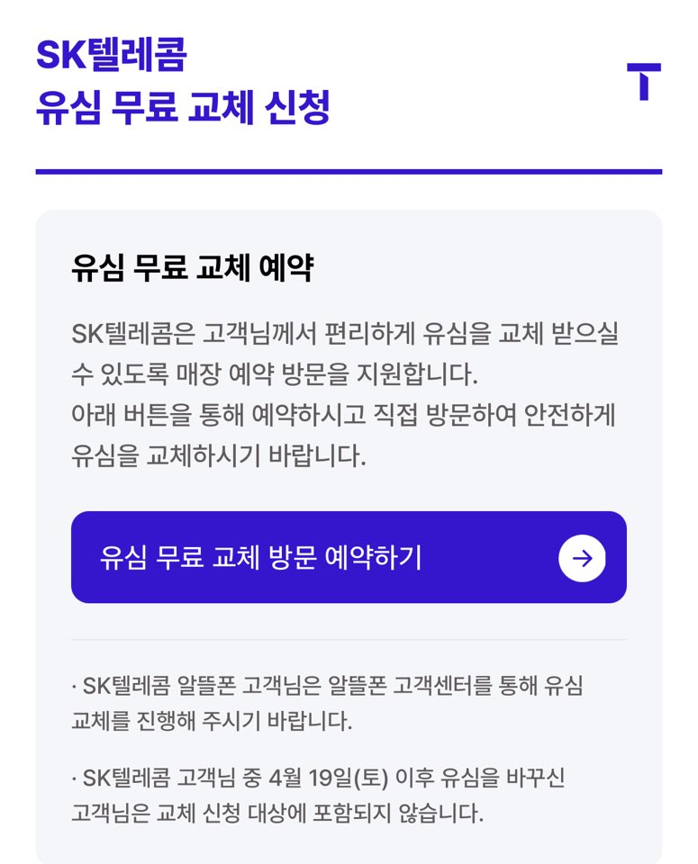 기존 유심 정보가 유출되었을 가능성이 있다면, 유심 교체를 통해 근본적인 보안 강화를 도모할 수 있습니다. SKT는 4월 28일(월) 부터 유심 무상 교체를 진행합니다. 매장에 방문하기 전, 유심 무료 교체를 예약하고 이용할 수 있습니다.