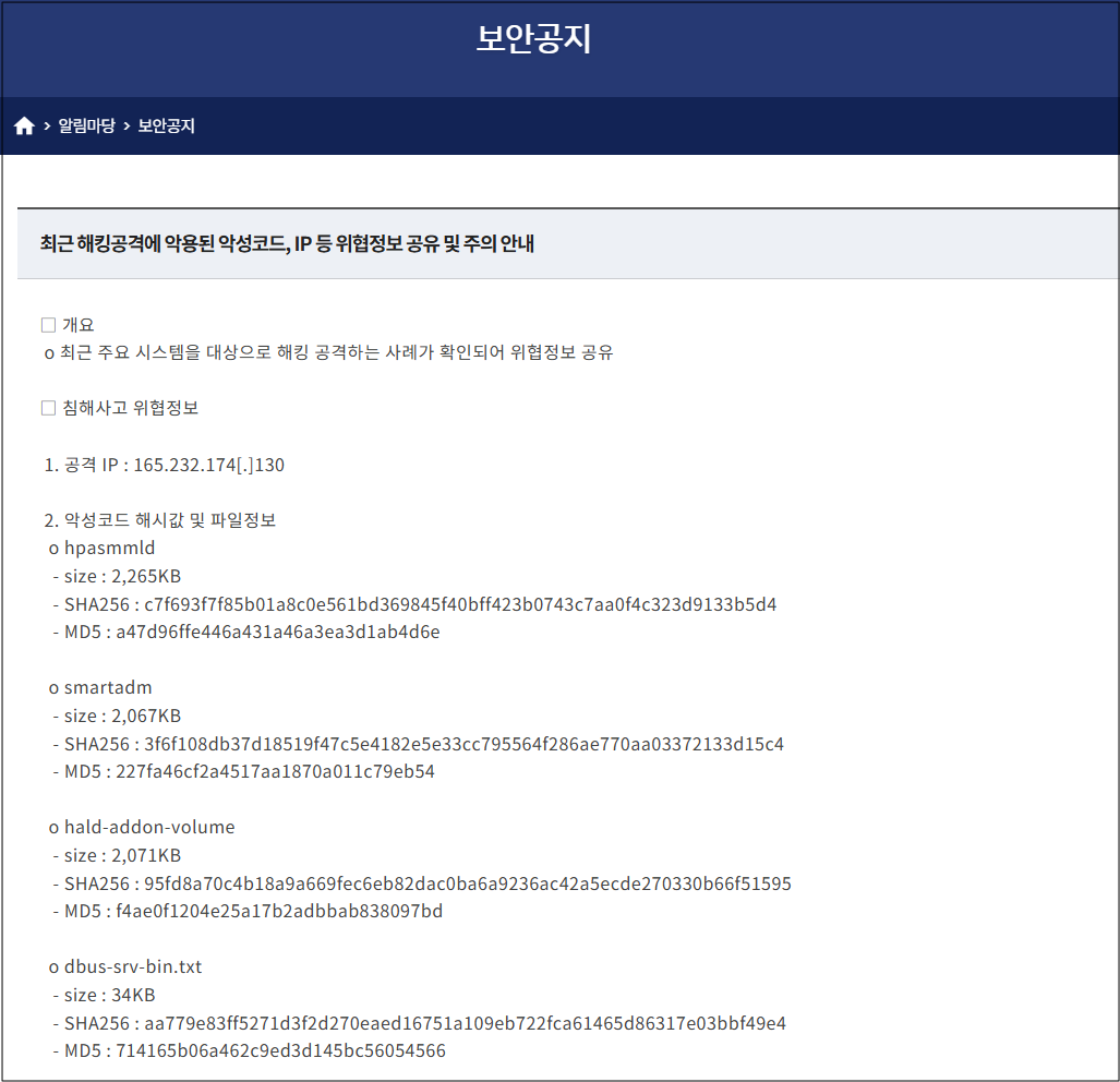 최근 한국 인터넷진흥원(KISA)에서는 "최근 해킹공격에 악용된 악성코드·IP 등 위협 정보 공유 및 주의 안내'" 공지를 공개하기도 했습니다.