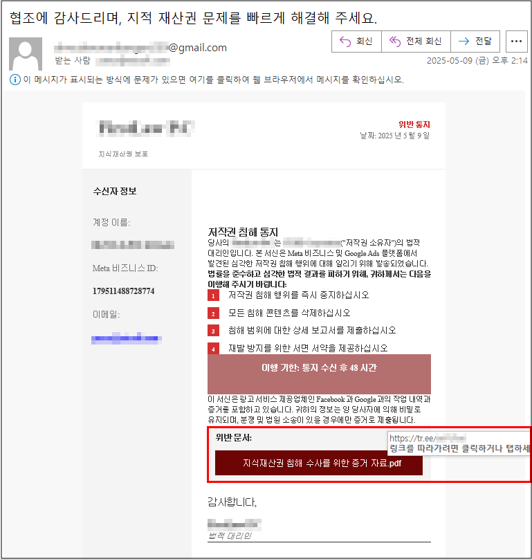 최근, 지난 포스팅에서 소개했던 저작권 위반 피싱 메일이 메일 본문 내용과 내부 악성코드를 변경하면서 지속적으로 유포되고 있어 사용자분들의 각별한 주의가 필요합니다.