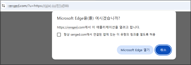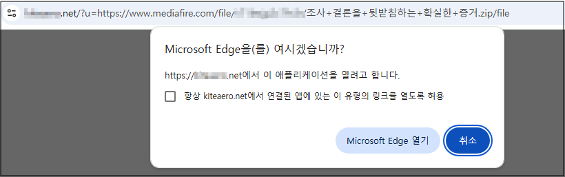 이때 사용자 PC의 기본 브라우저가 엣지가 아닌 경우, 엣지 브라우저 실행을 유도하는 메시지 창이 발생하며, 해당 메시지 창에서 ‘Microsoft Edge 열기’를 클릭 시 동일한 경로로 파일이 다운로드 됩니다.