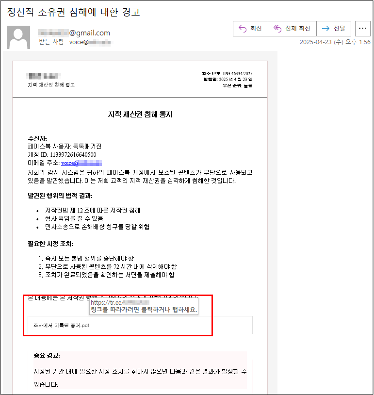 최근, 지난 포스팅에서 소개했던 저작권 위반 피싱 메일이 메일 본문 내용과 내부 악성코드를 변경하면서 지속적으로 유포되고 있어 사용자분들의 각별한 주의가 필요합니다.