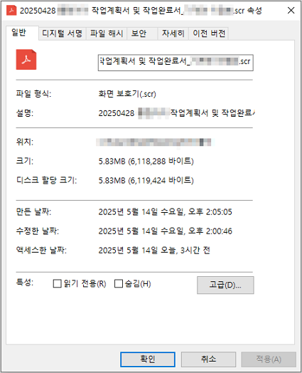 해당 악성 파일은 국내 유명 기업의 정상 인증서로 서명되어 있어 탐지 회피를 노렸으며, SCR 포맷의 실행 파일이지만 PDF 파일처럼 보이도록 아이콘이 조작되어 있습니다.