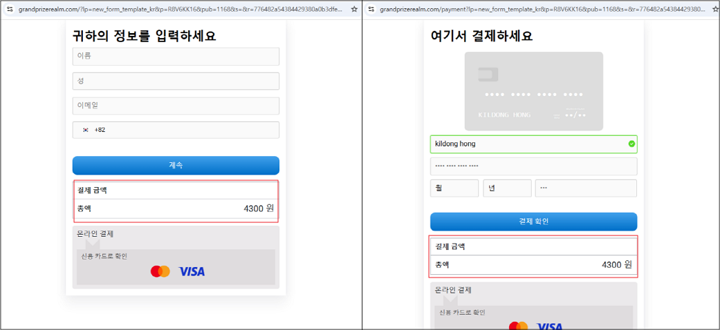 이번 피싱 공격은 배송 중지 사유로 배송비 결제를 유도하여 카드정보 입력부터 결제까지 자연스럽게 진행되도록 제작되었습니다. 사용자가 주의를 기울이지 않으면 피싱 공격임을 인지하기 어려워 피해로 이어질 수 있습니다.