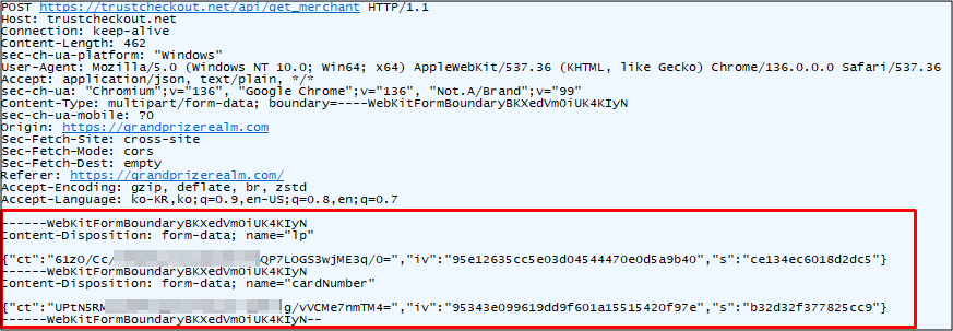입력된 개인정보와 신용카드 정보는 모두 공격자 서버로 전송되며, 개인 정보는 평문으로 그대로 전달되나, 신용카드 정보는 AES-256 방식으로 암호화되어 전송됩니다.