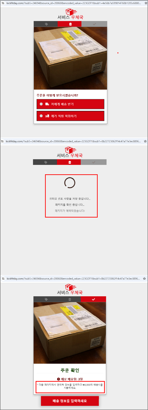 메시지 확인 시 송장번호로 배송 상품을 직접 조회한 것처럼 허위 배송 조회 결과를 보여주며, 사용자가 배송 일정 설정을 진행하도록 유도합니다.