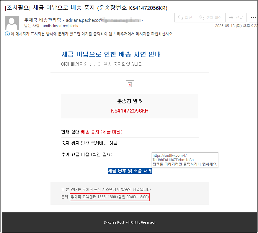 피싱 메일은 ‘[조치필요] 세금 미납으로 배송 중지 (운송장번호 K541472056KR)’ 라는 제목으로 발송 되었으며, 우체국에서 발송된 메일로 위장하기 위해 실제 우체국 고객센터 번호가 기재되어 있습니다.