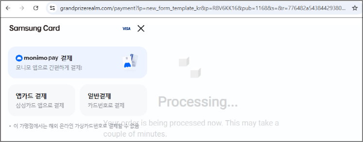 카드정보 입력이 끝나면 입력된 카드정보를 바탕으로 해당 카드사 정상 결제 페이지 화면을 띄우고 실제 배송비 결제 진행을 유도합니다.