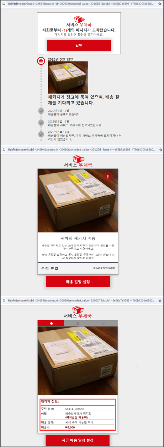 사용자가 우체국 메일로 오인하여 해당 링크를 클릭하게 되면 우체국 배송조회 사이트로 위장한 피싱 페이지로 연결되며, 우체국에서 도착한 메시지 확인을 안내합니다.