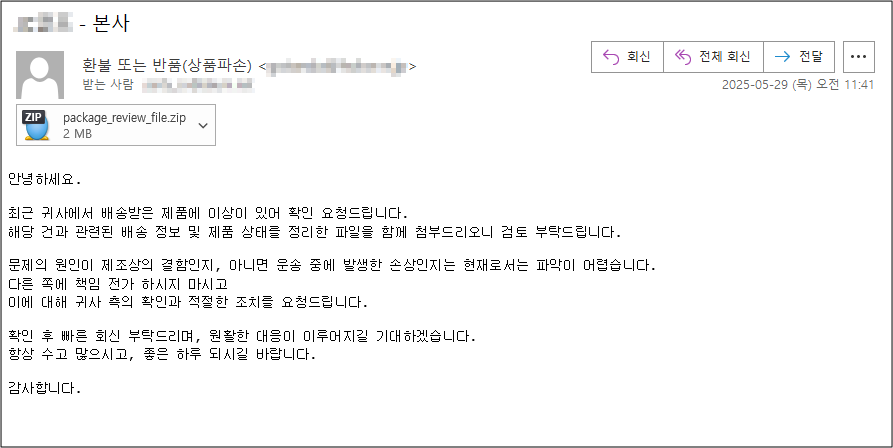 최근 온라인 쇼핑몰 판매업체들을 대상으로 배송 상품 파손을 사유로 반품을 요청하는 피싱 메일이 유포되고 있어 사용자분들의 주의가 필요합니다.