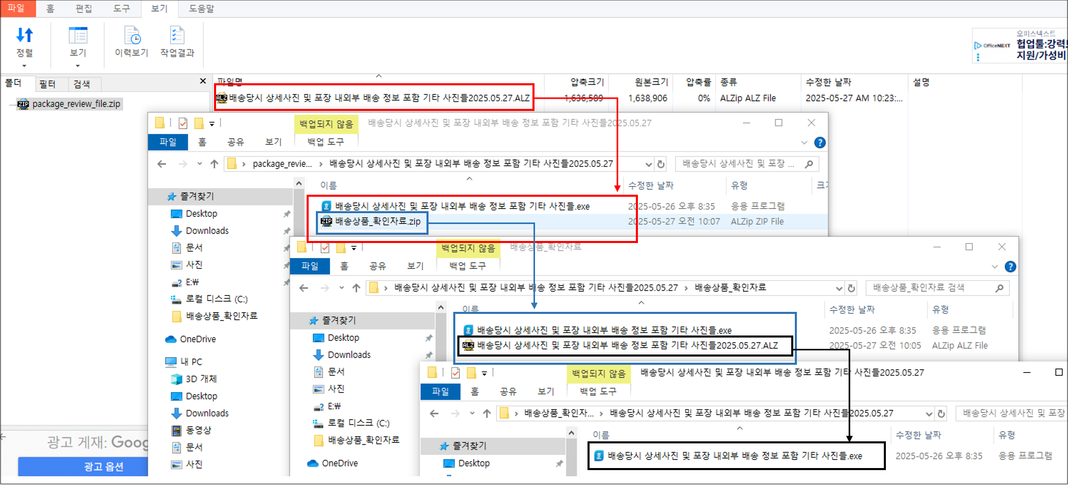 각각의 압축파일에는 ‘배송 당시 상세 사진 및 포장 내외부 배송 정보 포함 기타 사진들. exe’라는 실행파일이 동일하게 존재하고, 해당 파일은 문서파일 아이콘으로 위장되어 있습니다.