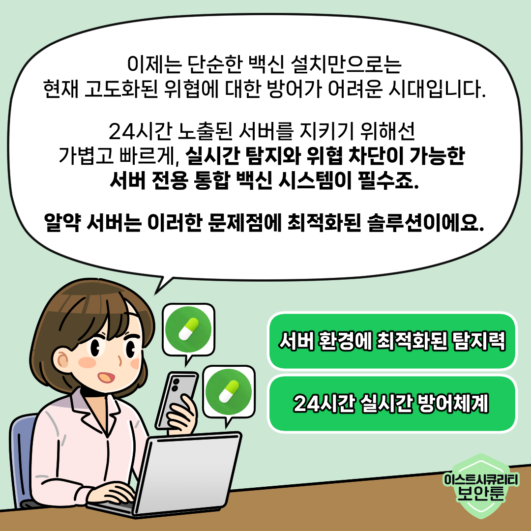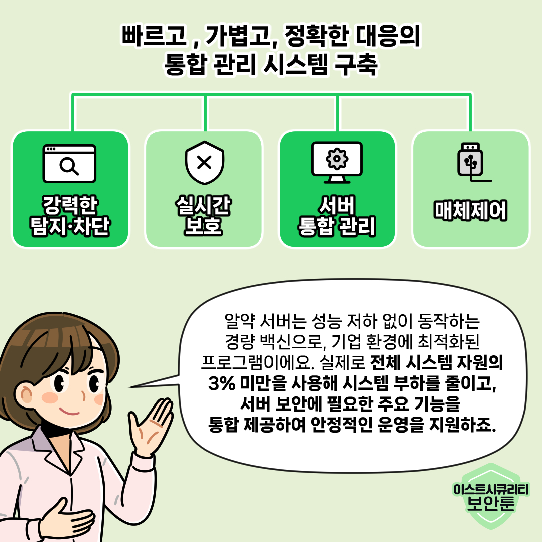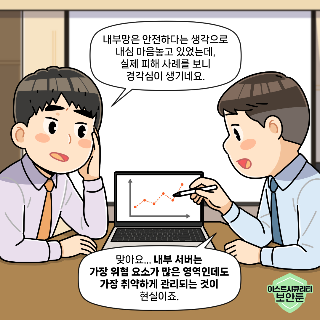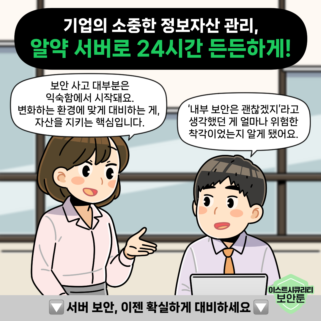 이번 보안툰에서는 '익숙함 속에서 방심하기 쉬운 내부 서버'가 얼마나 취약할 수 있는지 그리고 이를 정확하고 빠르게 보호할 수 있는 방법이 무엇인지 함께 살펴봅니다. 이제는 서버도, 제대로 대비할 때입니다!