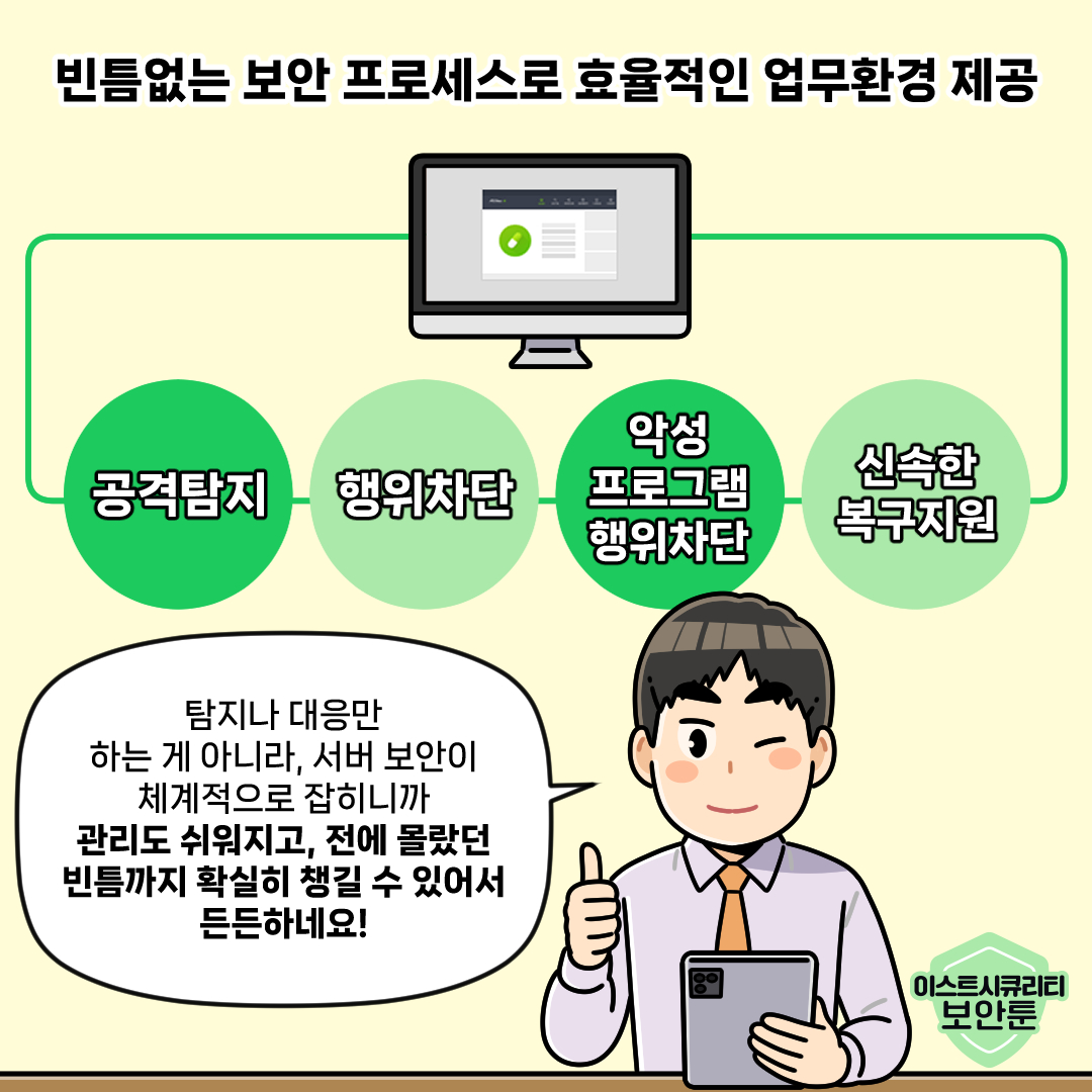 이번 보안툰에서는 '익숙함 속에서 방심하기 쉬운 내부 서버'가 얼마나 취약할 수 있는지 그리고 이를 정확하고 빠르게 보호할 수 있는 방법이 무엇인지 함께 살펴봅니다. 이제는 서버도, 제대로 대비할 때입니다!