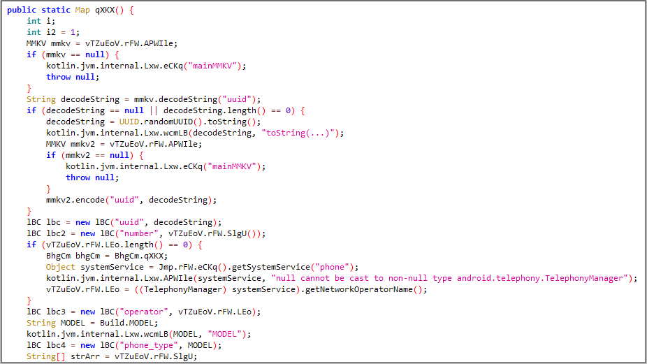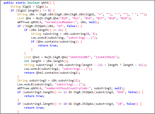 이외에도 에뮬레이터나 테스트 환경에서 사용되는 더미 번호와 핸드폰 번호의 자릿수도 확인하는 등 국내 사용자를 타깃으로 제작된 앱으로 판단됩니다.
