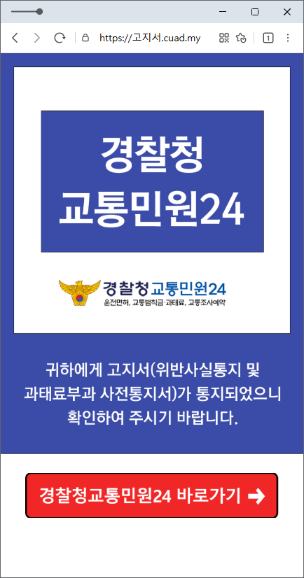 [국제발신][*교통민원24] 귀하에게 고지서가 발부되었습니다. hxxps://고지서.cuad.my