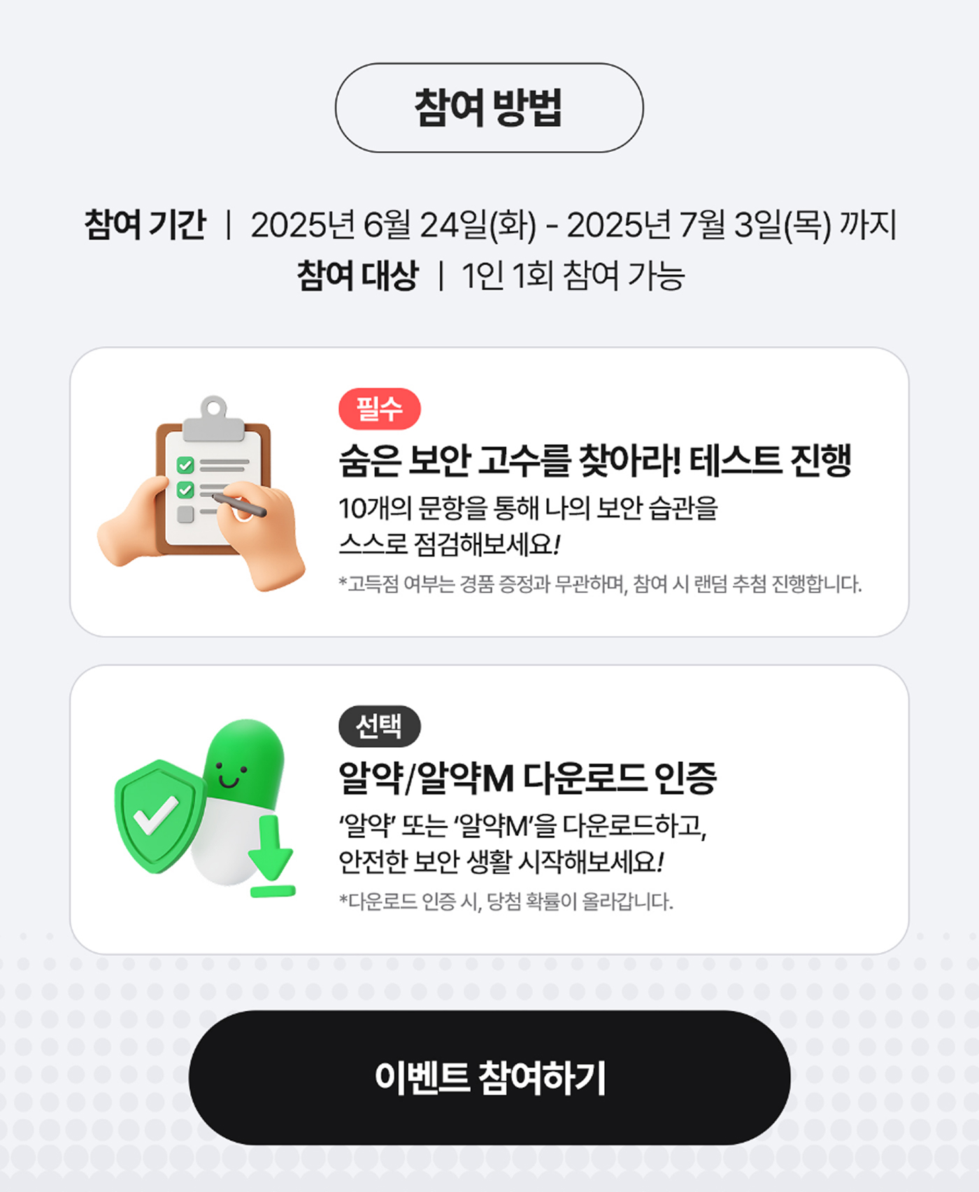 이벤트 참여 전, ‘알약(PC)’ 또는 ‘알약M(모바일)’ 앱을 설치한 후, 설치 화면을 캡처하여 인증하면 당첨 확률이 높아집니다!