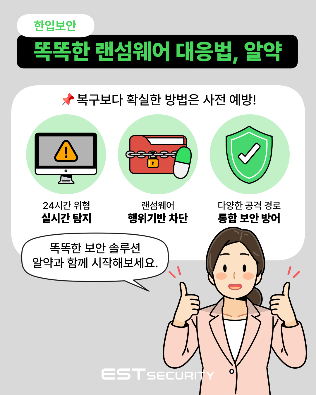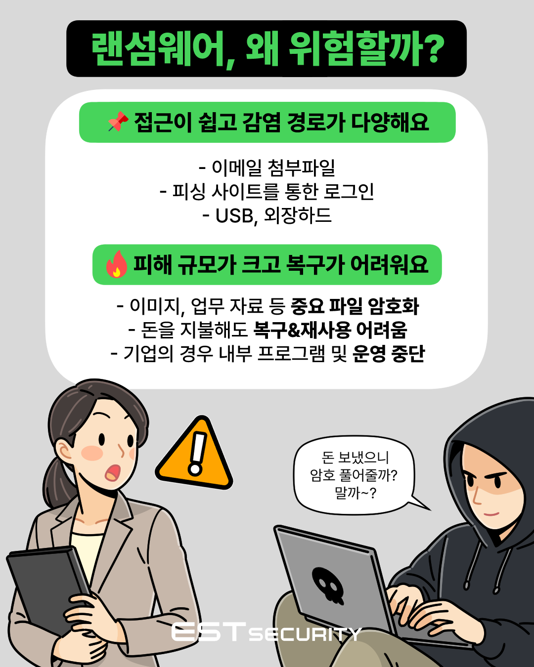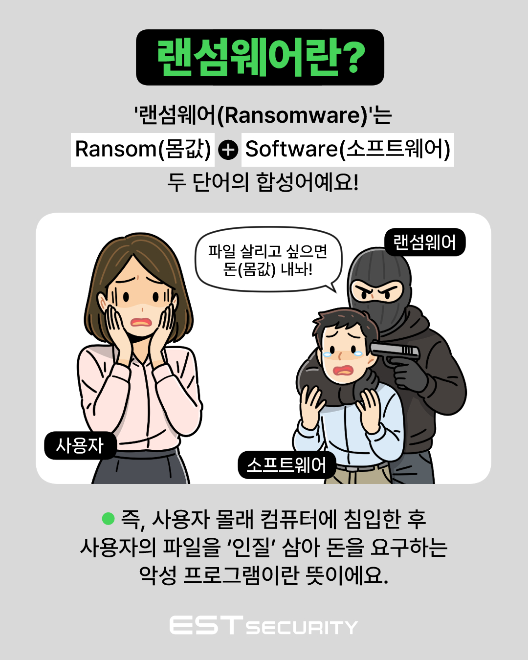 하지만 막연한 공포보다 더 중요한 건, 랜섬웨어가 무엇인지, 왜 위험한지, 어떻게 대응할 수 있는지 정확히 아는 것입니다. 그래서 준비했습니다! 쉽고 빠르게 핵심만 전달하는 보안 콘텐츠 시리즈 <한입보안>, 이번 시간에는 ‘데이터 협박범’ 랜섬웨어에 대해 함께 알아보겠습니다. 지금 아래 콘텐츠를 통해 랜섬웨어의 정체와 예방법을 한입에 쏙! 확인해보세요.