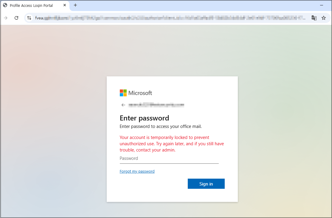 캡차 인증을 진행한 후에는 마이크로소프트 계정 로그인 페이지로 위장한 피싱 페이지로 이동되고, 계정 비밀번호 입력을 유도합니다.