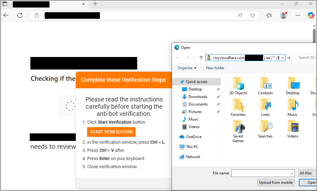 사용자가 안내된 내용에 따라 [START VERIFICATION] 버튼을 클릭하게 되면 파워쉘 명령어가 클릭보드로 복사되고, 이후 윈도우 탐색기를 실행하여 주소창에 붙여 넣으면 파워셀 스크립트가 실행되어, 최종적으로 Interlock RAT이 실행되게 됩니다.