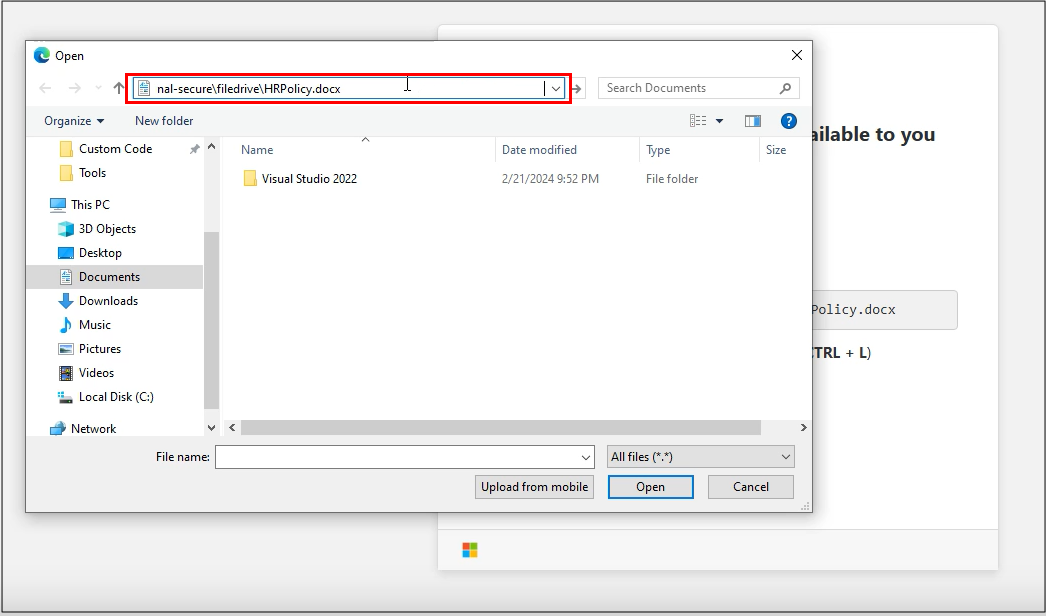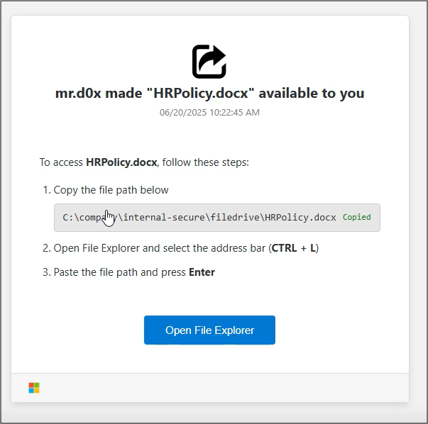 해당 공격은 보안 연구원 mrd0x가 ClickFix의 개념 증명(PoC) 대안인 FileFix를 시연하면서 개발되었고, 연구원이 고안한 공격 시나리오에 따르면 공격자는 피싱 페이지에서 “파일이 공유 되었다”라는 안내와 함께, 파일에 접근하기 위한 절차를 안내합니다.