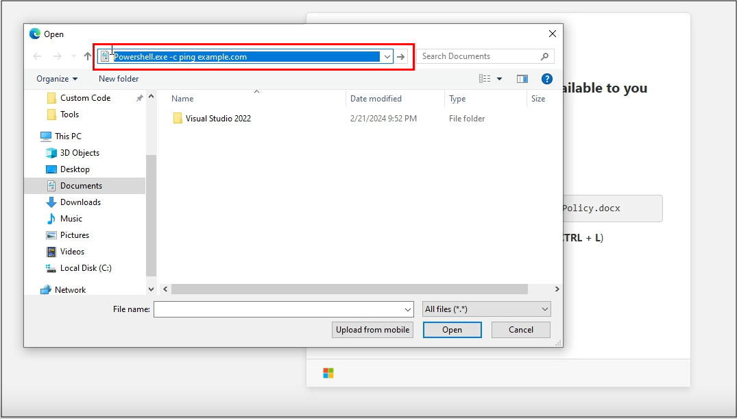 예시) " Powershell.exe -c ping example.com<space># C:\<path_to_file>\decoy.doc<space> "