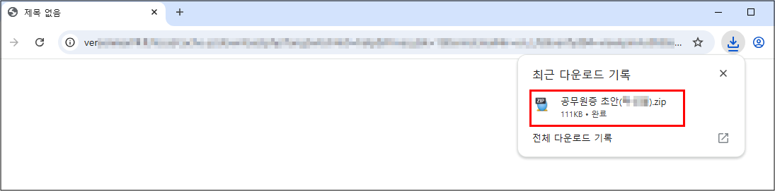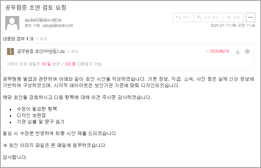 첨부파일은 대용량 첨부파일 형태이며, 클릭 시 외부 링크를 통해 ‘공무원증 초안(이름).zip’ 파일이 다운로드 됩니다.