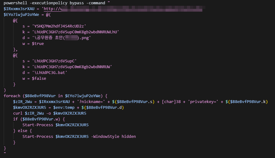 복호화된 명령어는 파워쉘 명령어로 공격자의 서버(C2)에서 먼저 사용자를 속이기 위한 미끼 파일(Decoy)인 '공무원증 초안(이름).png' 파일을 %TEMP% 폴더에 다운로드하여 보여 줍니다.