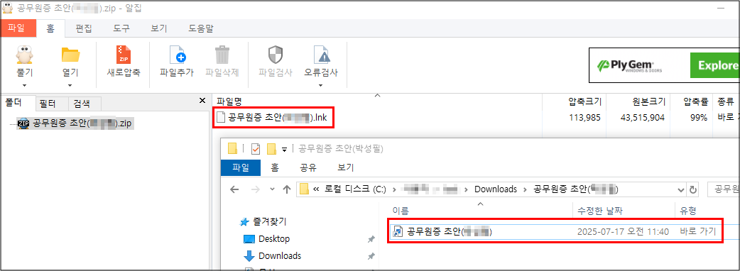 다운로드 된 ZIP 포맷 압축 파일에는 이미지 파일 아이콘으로 위장한 LNK 바로가기 파일이 존재합니다.
