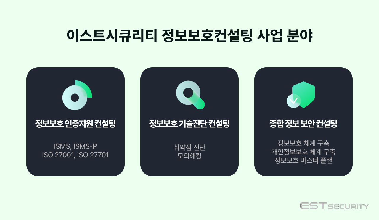 이스트시큐리티는 수많은 기업과 공공기관의 정보보호 인증 프로젝트를 수행해온 풍부한 경험을 바탕으로, ISMS-P 인증을 위한 사전 진단, GAP 분석, 정책 수립, 문서화, 교육, 모의심사까지 전 단계를 밀착 지원하는 정보보보 컨설팅 서비스를 제공하고 있습니다.