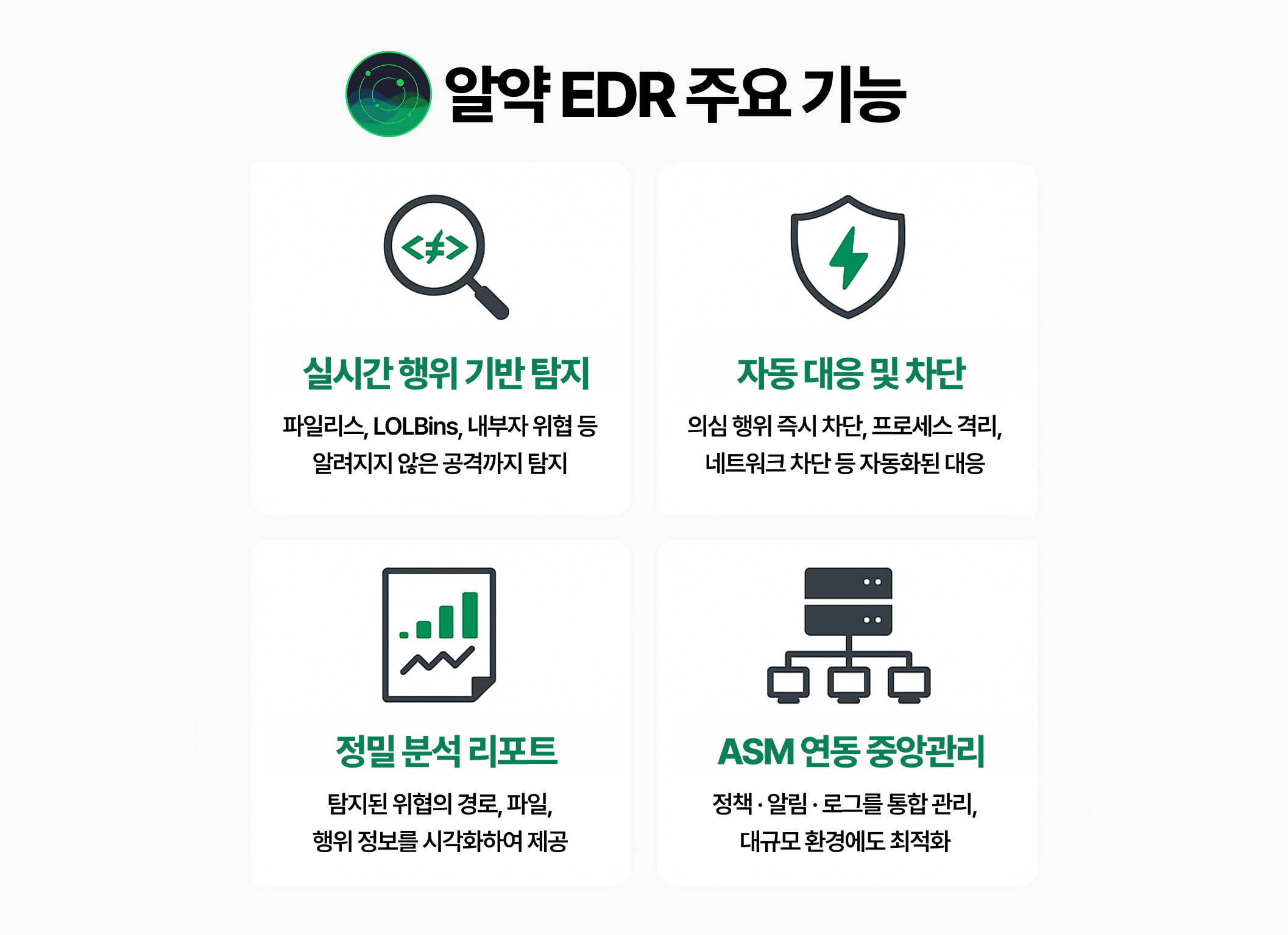 알약 EDR은 시스템 내부에서 벌어지는 이상 행위를 실시간 감시하고, 머신러닝 기반 분석을 통해 악성 여부를 즉시 판단합니다. 이후 자동 격리·차단과 공격 과정 리포트 생성까지 한 번에 수행합니다.
