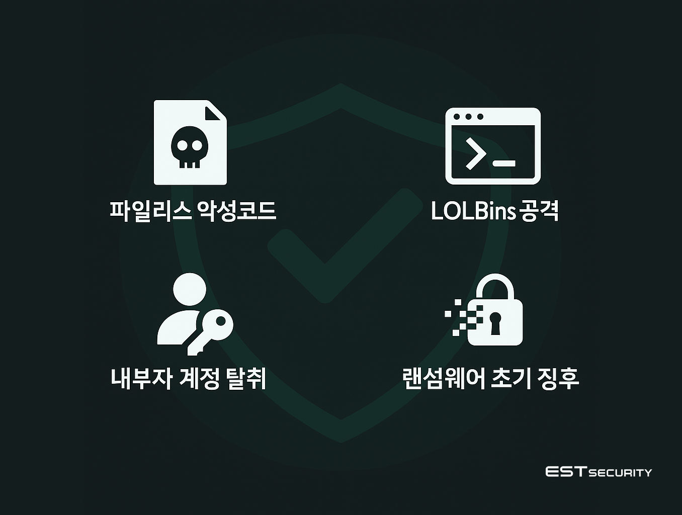 최근 공격자들은 파일을 남기지 않는 Fileless 공격, 정식 프로그램을 악용한 LOLBins 공격, 메모리 기반 실행, 내부자 계정 탈취 등 기존 백신의 탐지망을 교묘히 피하는 방식을 사용하고 있습니다.